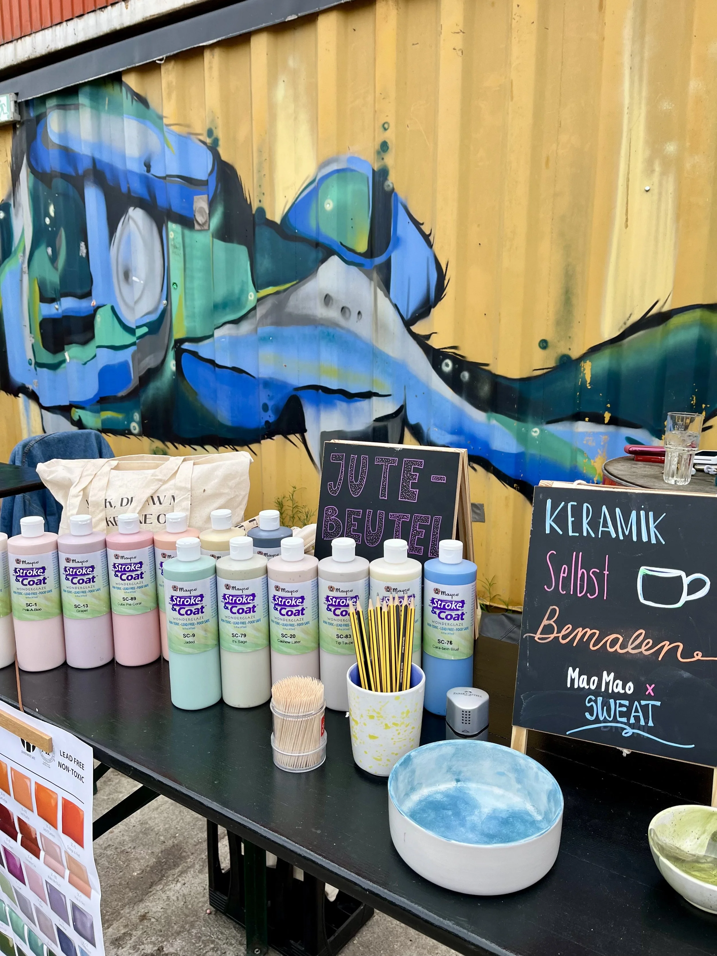 Keramik unter freiem Himmel bemalen, bei guter Musik, Sonnenschein und einem kühlen Drink, das war nicht nur für uns ein echtes Erlebnis. Viele Besucher*innen kamen direkt nach dem Workout oder Yoga bei uns vorbei, um durchzuatmen, runterzukommen und für einen Moment ganz im Hier und Jetzt zu sein.