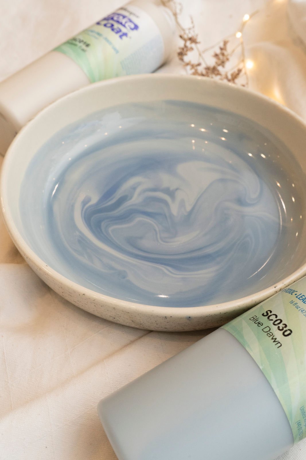 Marmoriere Deine Keramik, indem du sie behutsam mit zwei konträren Farben ausschwenkst. Wichtig dabei: Verwende nicht zu viel Farbmischung, damit sich nicht zu viel Flüssigkeit im Inneren deiner Keramik sammelt.