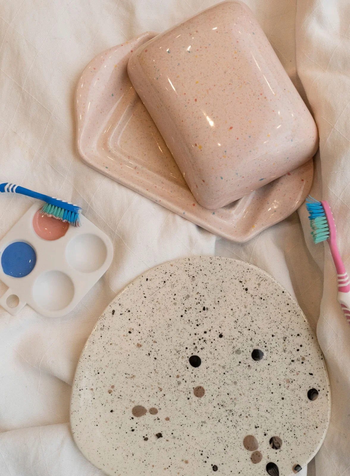 Tauche die Zahnbürste einfach in Deine Lieblingsfarbe ein und fahre mit Deinem Daumen über die Bürsten. So erhältst Du die typischen, zufälligen "Punkte” auf Deiner Keramik.